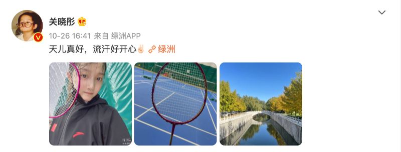 再對比之前關曉彤26號時發過的微博,當時她發文表示:「天兒真好,流汗好開心」