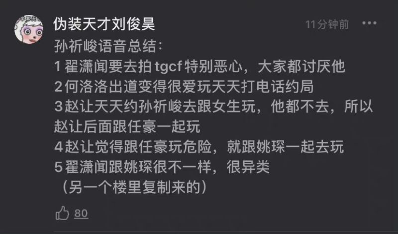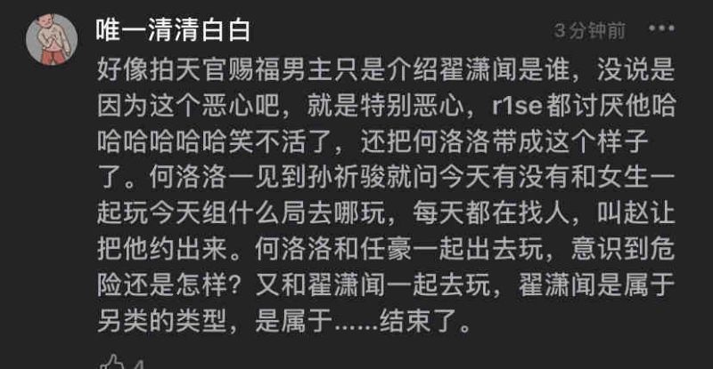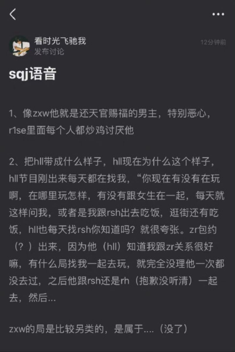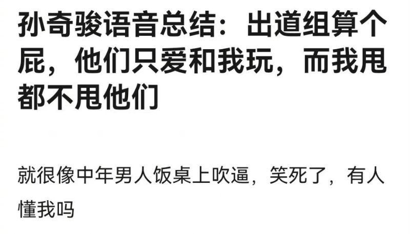 除此之外,還跟以前的公司合夥人白女士有特別關係。該網友還表示兩人戀愛期間,孫祈駿身上的貴重物品大多是她買的,戀愛期間的開銷也是她承擔,分手後孫祈駿卻不願意還錢。隨後該網友放出了孫圻峻吐槽R1SE成員的音頻,包括翟潇聞、何洛洛、任豪、趙讓等!