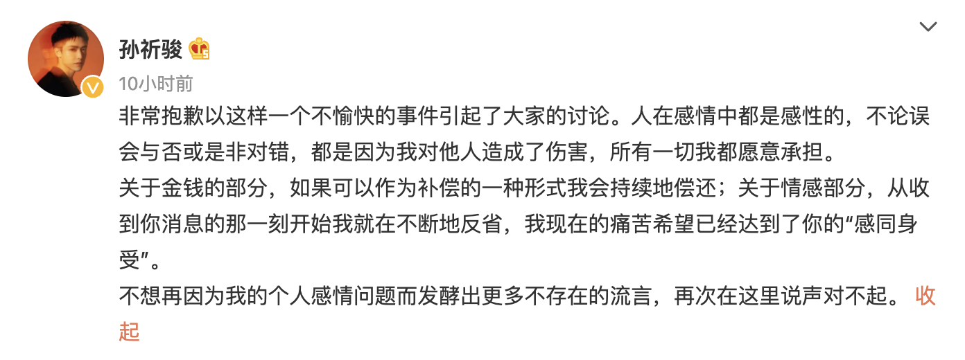 最近果然塌房塌得很徹底啊!表示網友『echopolyly』在沒有任何預告下,1號晚上曝光了創造營2019選手孫祈駿(之前名:孫圻峻)的黑料,直指他在和自己戀愛期間,還與某女愛豆已經戀愛兩年半,處于腳踏兩條船的狀態。