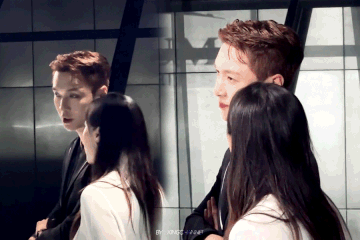 當盧靖姍走上前和工作人員交談時,張藝興留意到盧靖姍的服裝後,立刻下意識避開了視線和向後退,嗚哇!