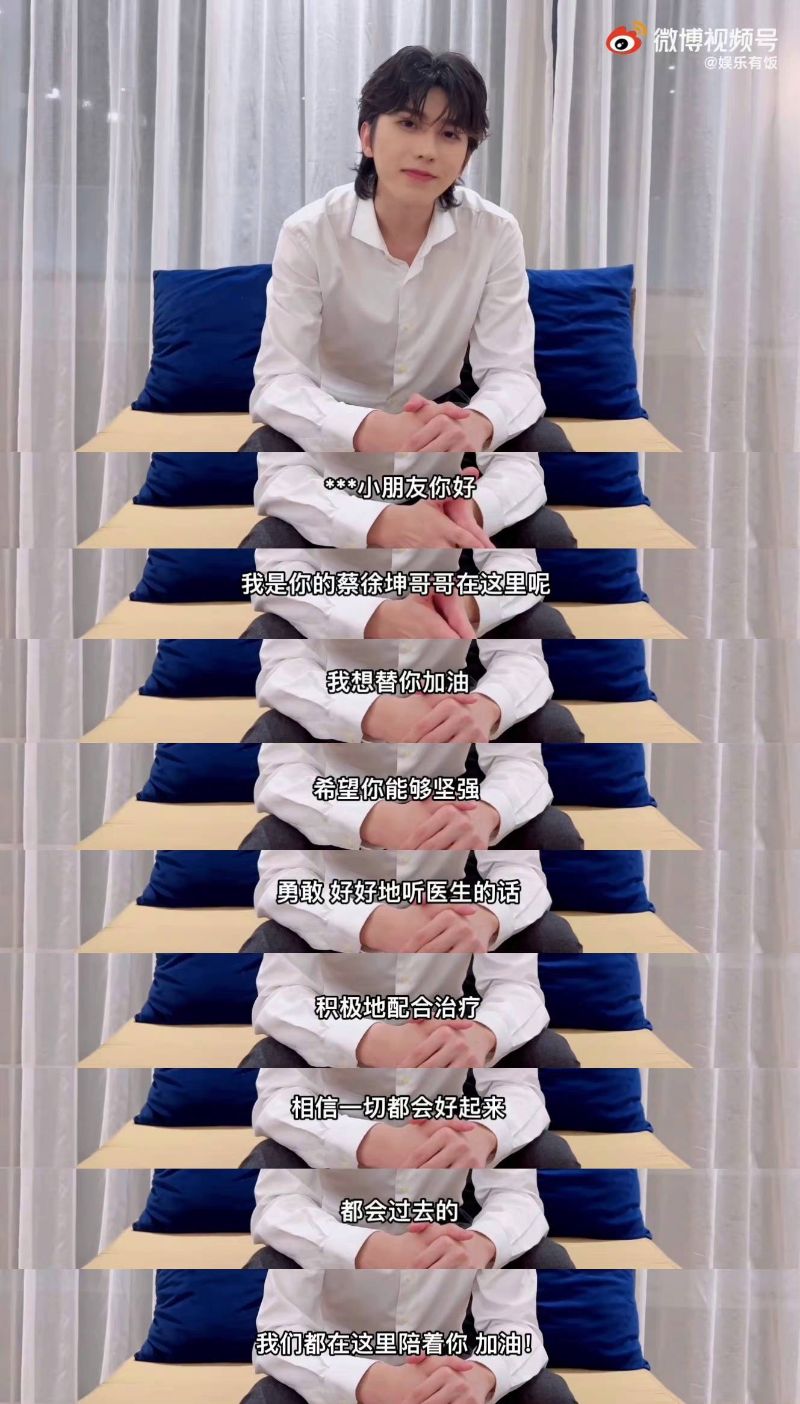 除了捐款,蔡徐坤甚至還錄制了一段視頻給她打氣。視頻中,蔡徐坤超溫柔的囑咐小靜一定要聽醫生的話,好好治療,並表示會隨時關注她,希望她可以早日康複,重回校園:「我們都在這裏陪著你,加油。」嗚嗚嗚嗚嗚~暖哭了!
