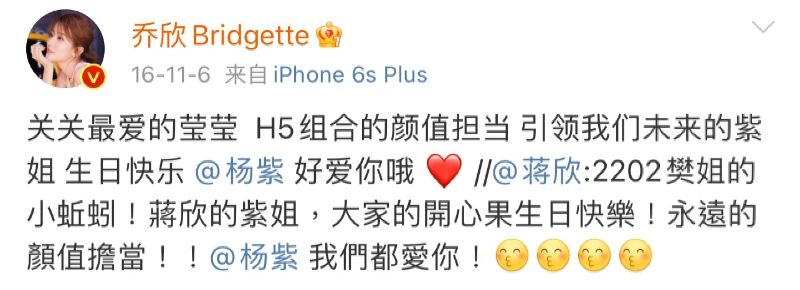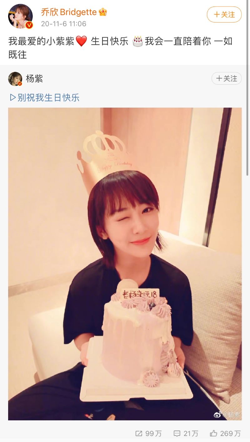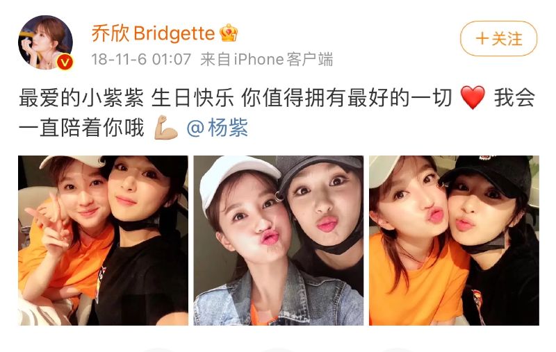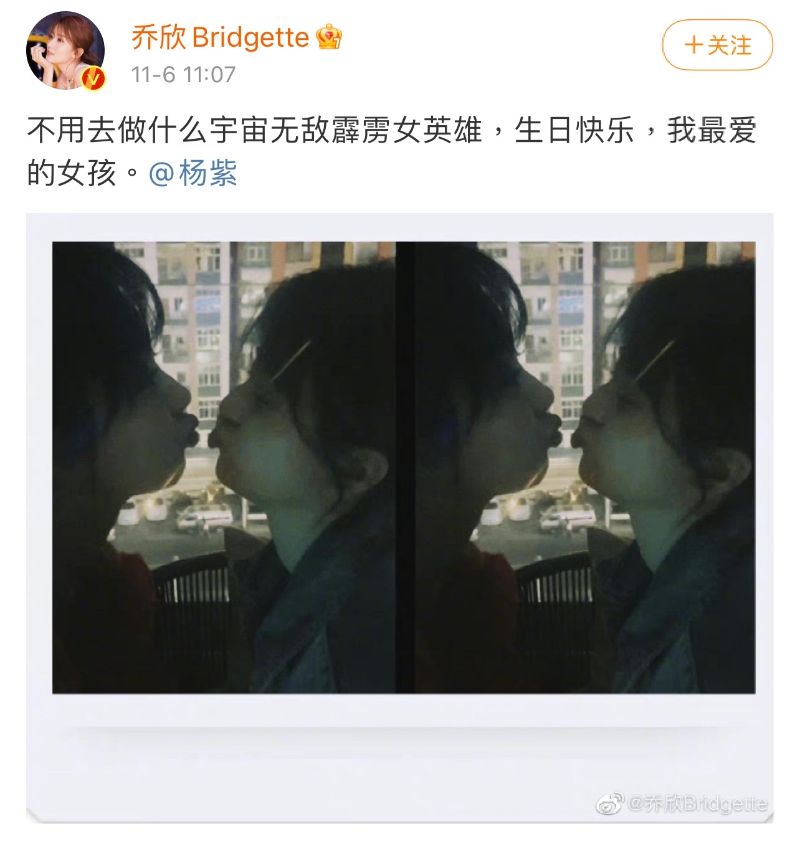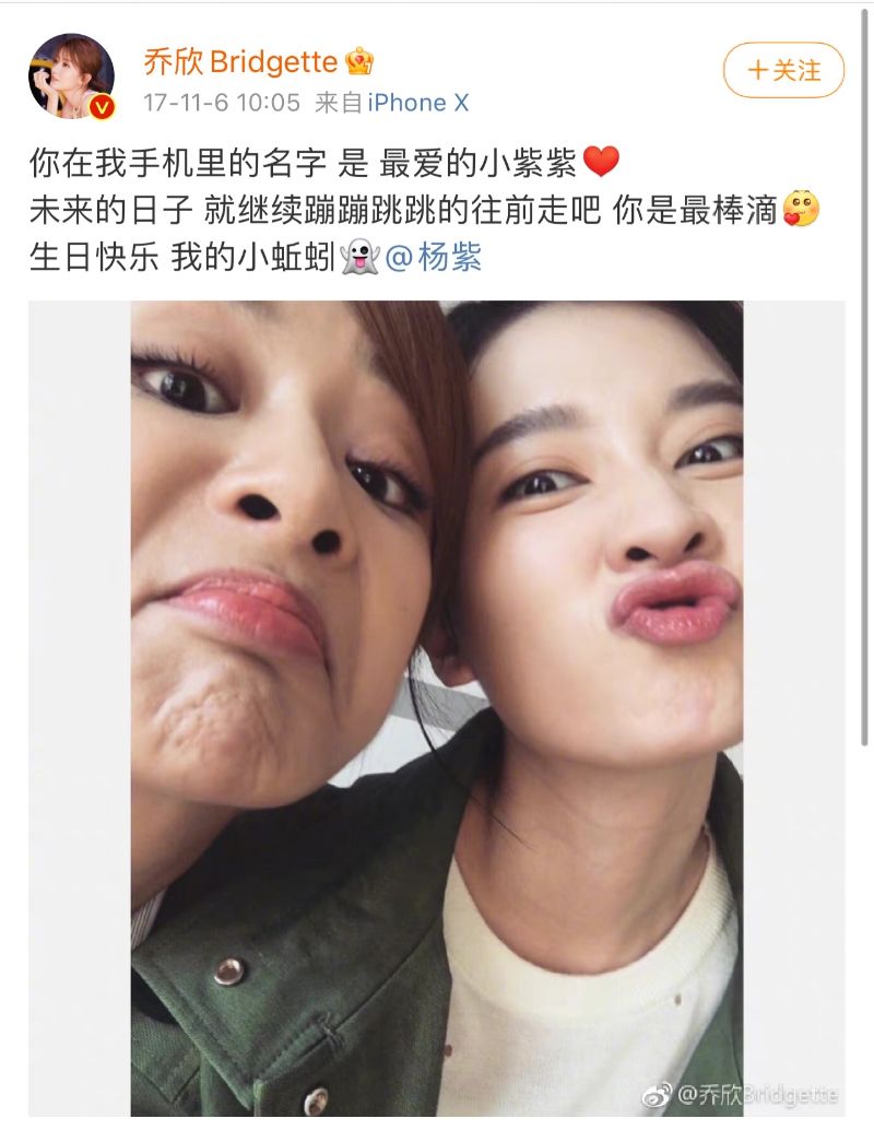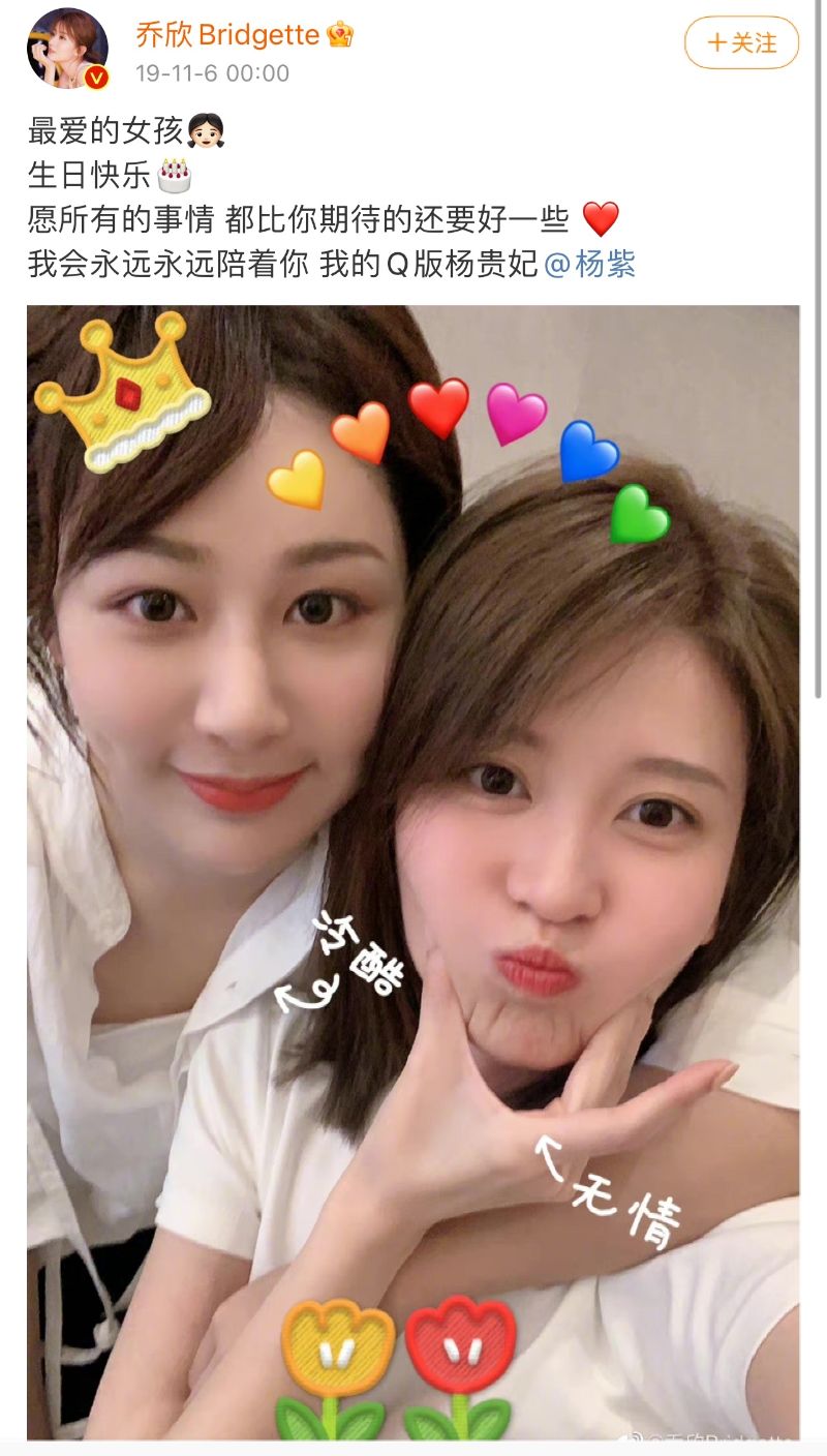 而在早上11點06分,也就是楊紫誕生日的時間,我們又蹲到了楊紫在圈內的超級閨蜜喬欣啦!!!只見她發文為小猴紫慶生,曬出了兩人合照,並配文:「不用去做什麽宇宙無敵霹雳女英雄,生日快樂,我最愛的女孩。」