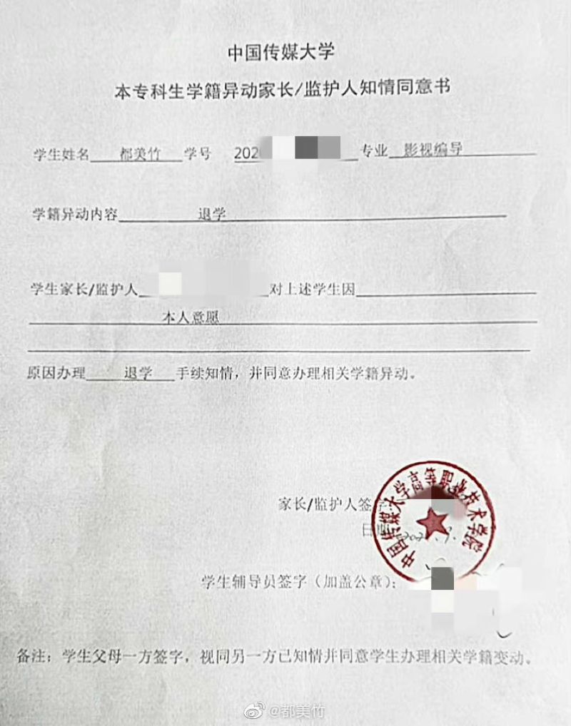 都美竹也公開了學校方面給予家長的同意書,顯示都美竹是辦理退學。