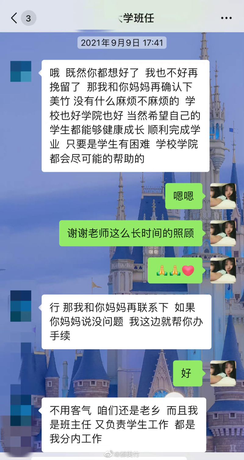 另外也公開了自己和大學班任的聊天截圖,顯示自己的確是自願辦理退學的。