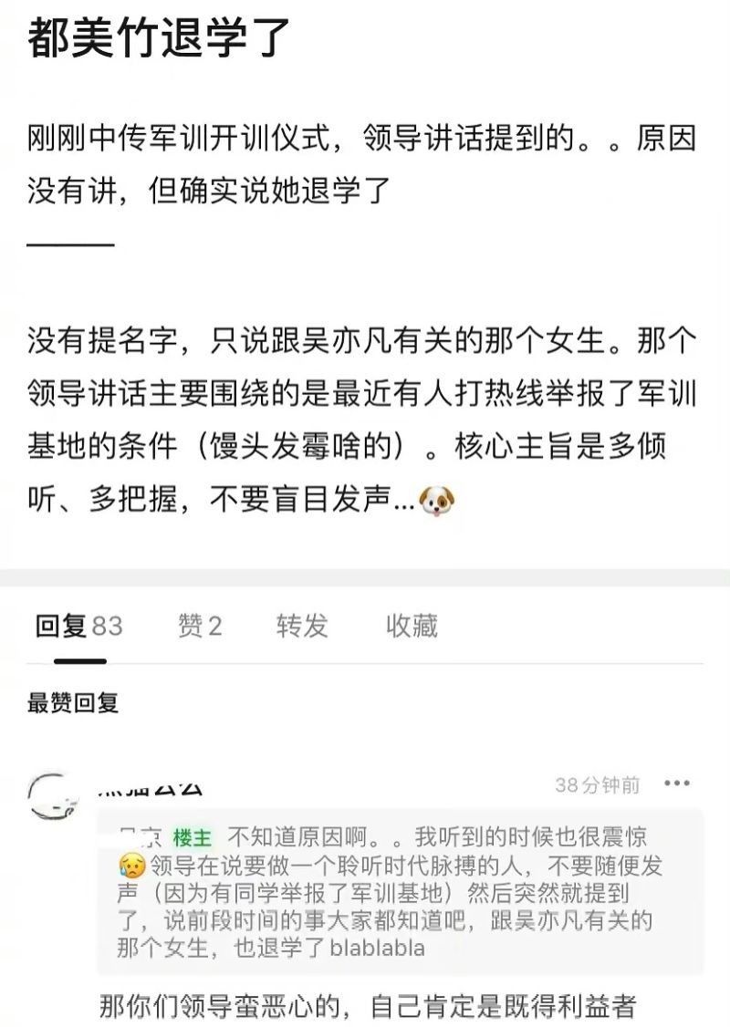 雖然吳亦凡已經被刑拘,但有關都美竹的傳聞一直沒平息,最近最常出現的傳聞,就是都美竹被其就讀的中傳大學退學了👇