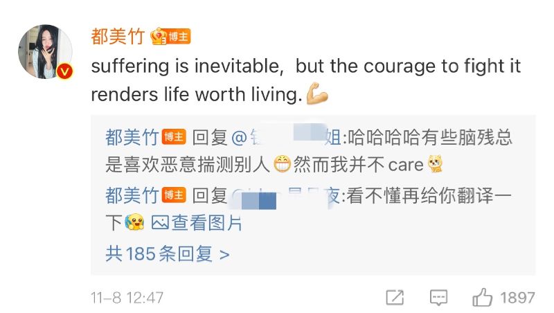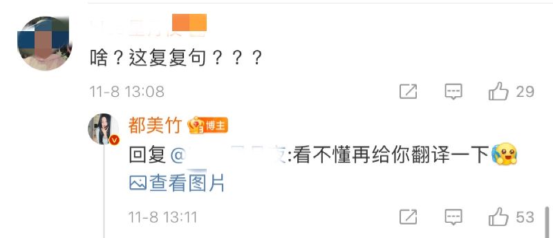 網友「啥?這複複句???」都美竹直接回復:「看不懂再給你翻譯一下!」