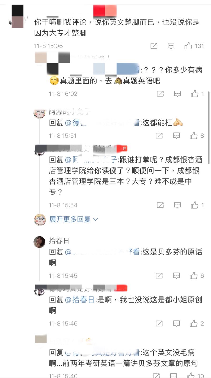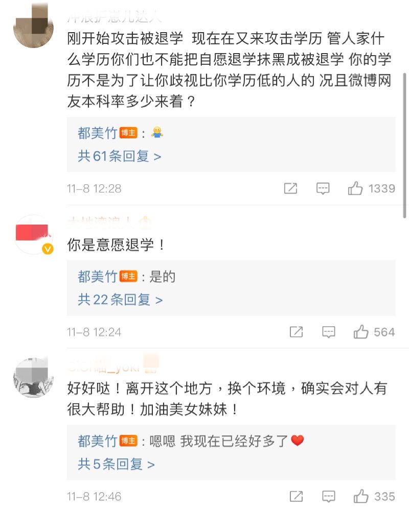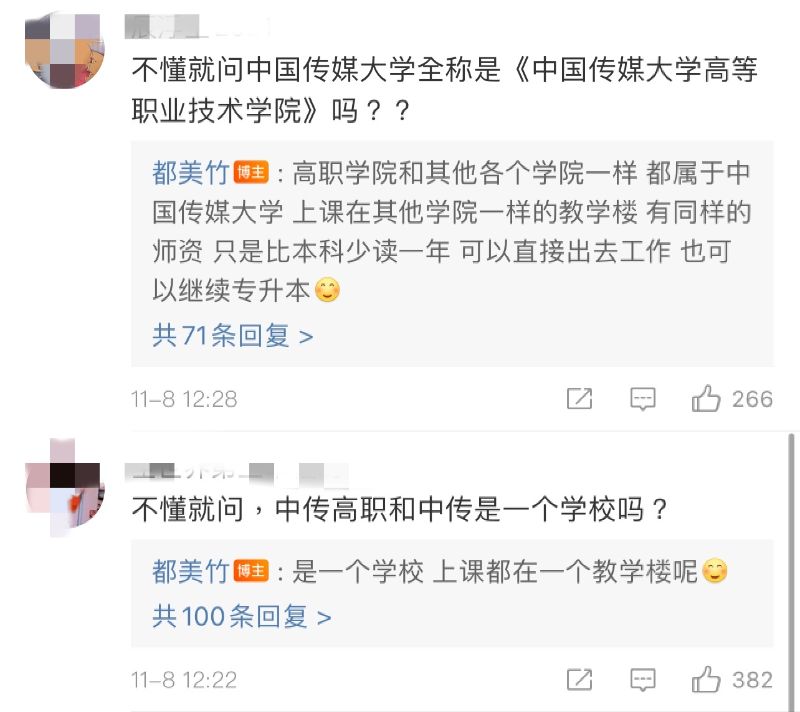 另外,由於之前不少人說都美竹學歷造假,明明只是《中國傳媒大學高等職業技術學院》,卻說自己是《中國傳媒大學》的學生。這次也有網友在評論區直接追問,都美竹選擇直接回復,表示高職學院一樣屬於中國傳媒大學,甚至還解釋起高職和本科的不同。