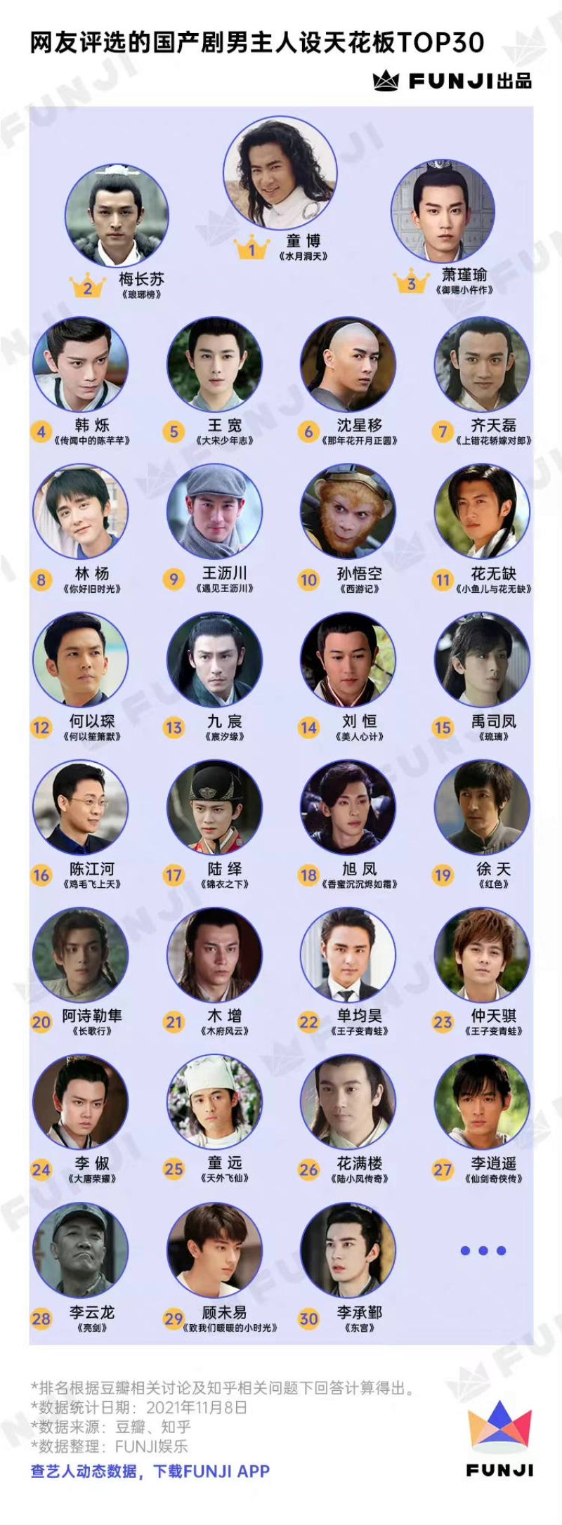 來來來!來看數據帖!沒錯,一向負責做大數據的FUNJI,公開了由豆瓣和知乎網友參與投票,票選出的《2021年國產劇男主人設天花板Top 20》排行榜,這就來看看在2021年至今的戲劇男神中,哪一個男神人設更受歡迎呢?
