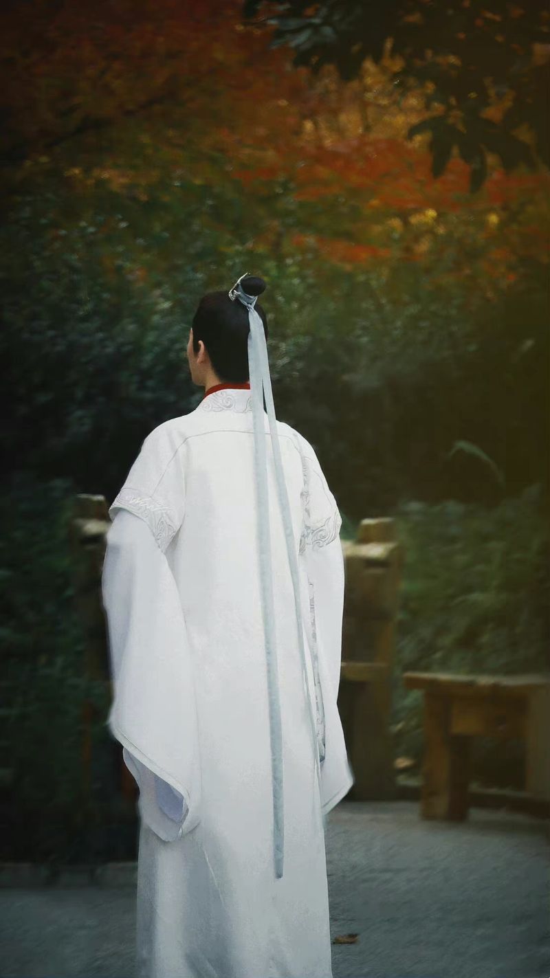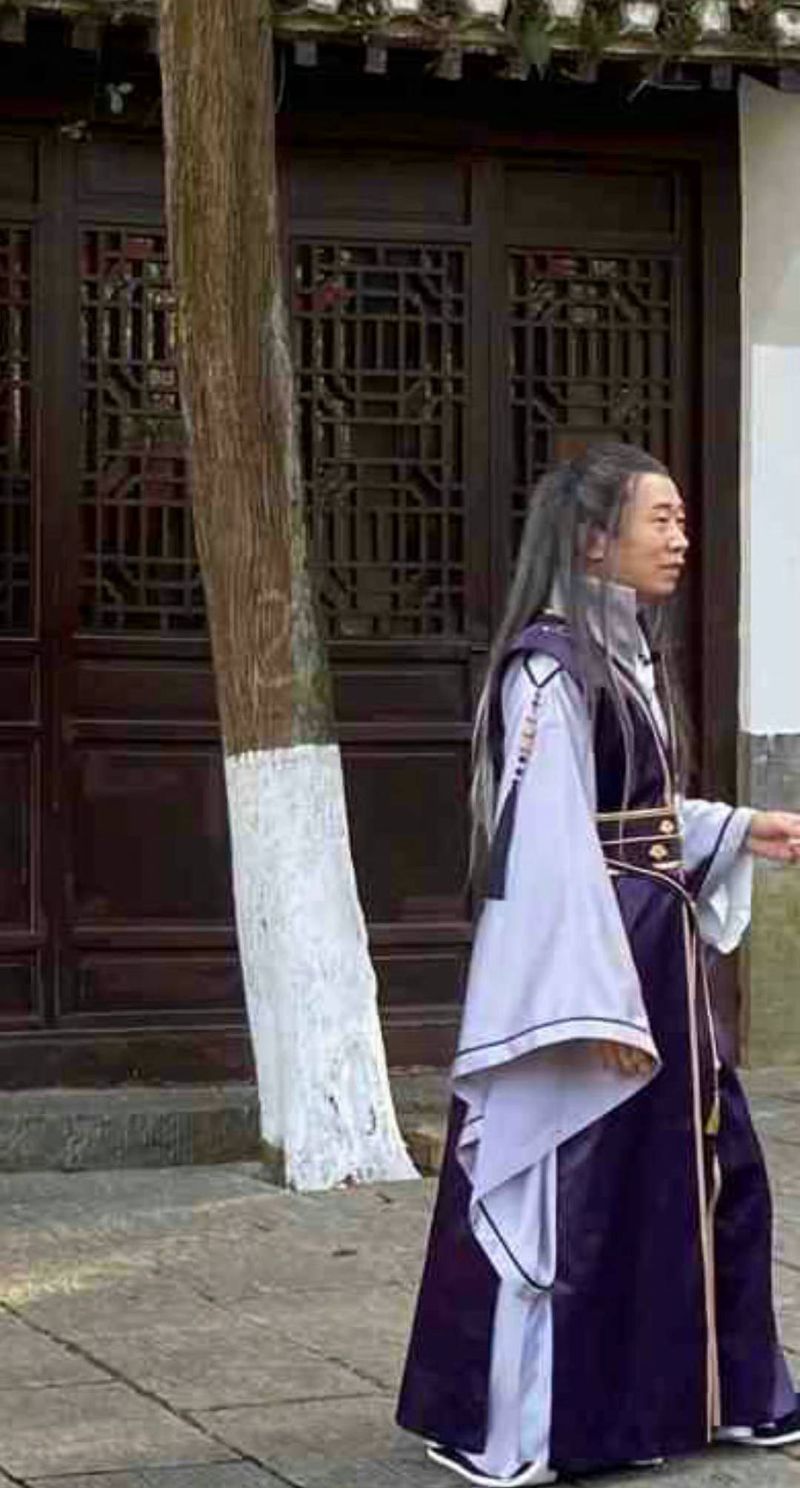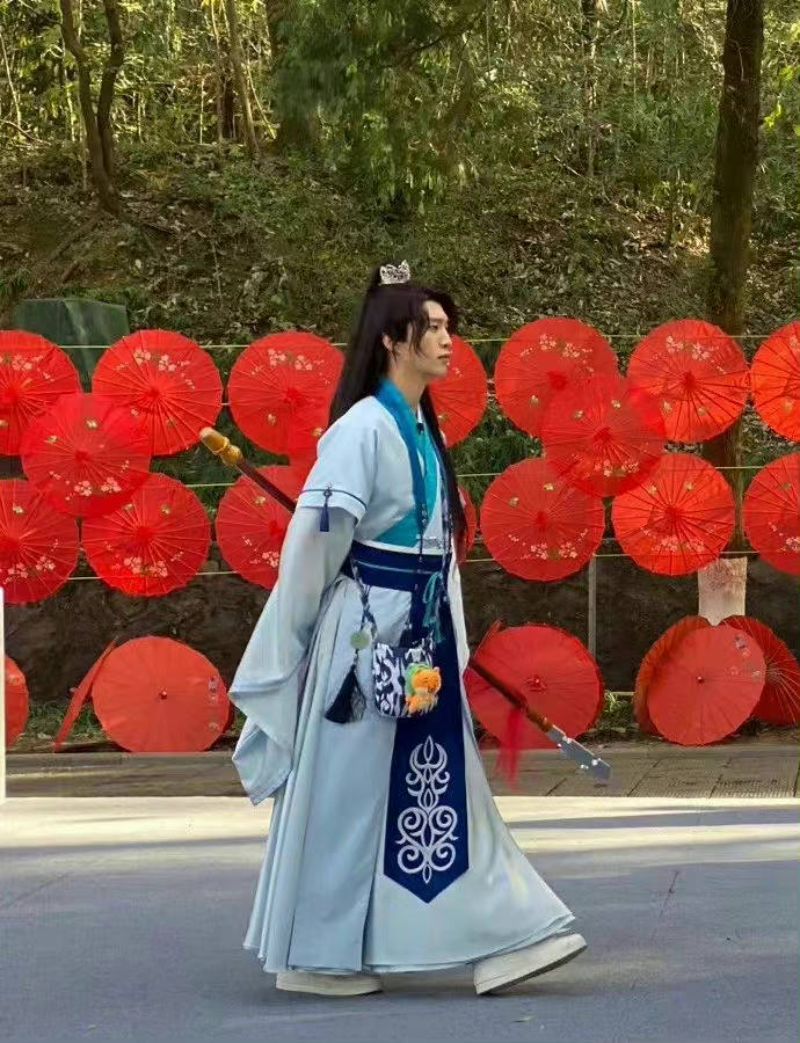 一身白藍相間的古裝加上一頭長髮,非常有古時候翩翩公子內味沒錯啦!