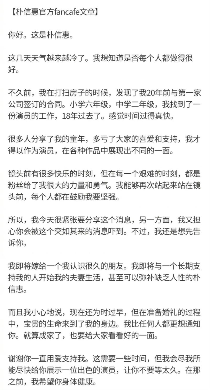 至于關于結婚的具體情況,因為只有兩家加人參與,將以非公開形式進行,希望大家諒解,感謝所有為兩人應援的人,朴信惠以後也會努力以演員的模樣給大家展現更好的樣子,謝謝。」