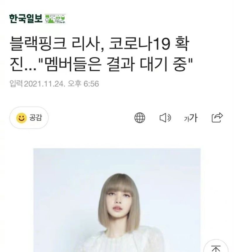 「BLACKPINK Lisa于 24 日下午被診斷出患有新冠肺炎。
