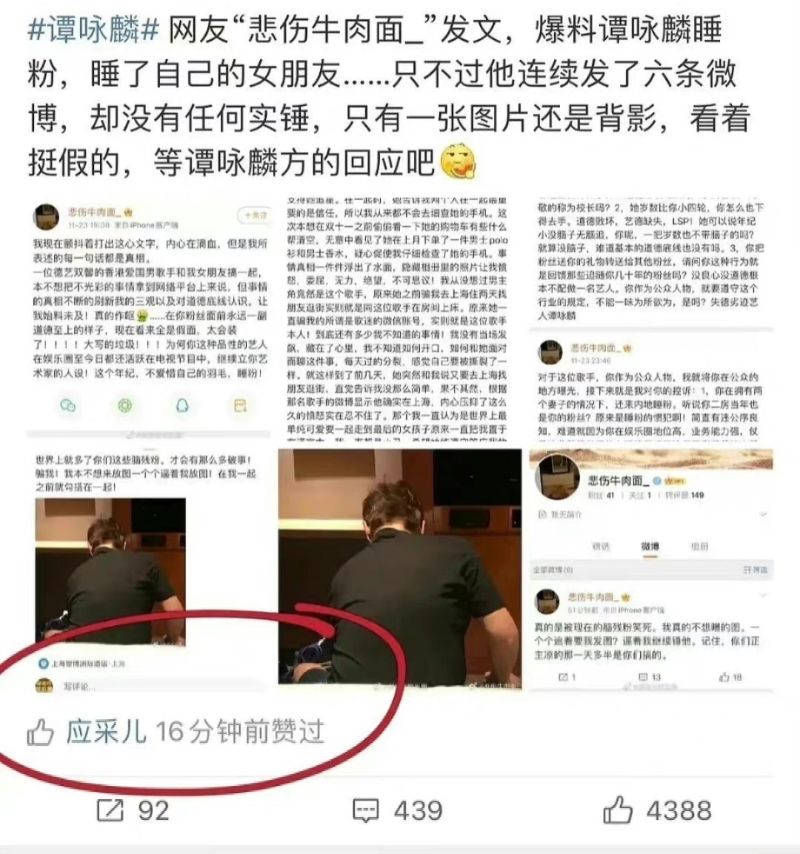 另外,這段爆料文的插曲是…有網友發現應采兒點讚了有關「譚詠麟睡粉」的報導。