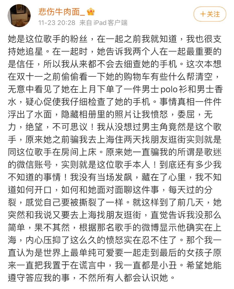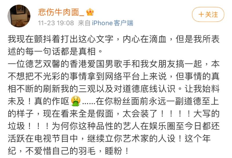 爆料文字是在11月23日晚開始,第一則微博中直接怒罵“一位德藝雙馨的香港愛國男歌手和我女朋友搞一起”,怒斥這位所謂的藝術家,所做的事情刷新了自己的三觀及道德底線的認識,讓人作嘔!