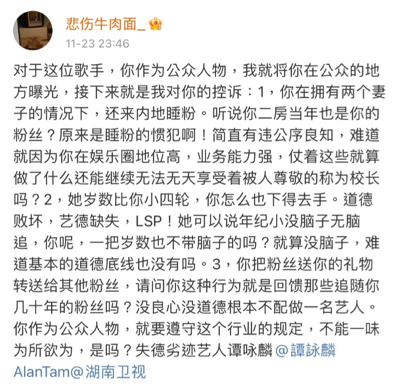 到了第三條,這位網友怒斥這位男歌手,已經擁有兩個妻子了還來內地睡粉,指責他是睡粉慣犯。該網友指責表示女友年齡比他小了四輪,沒良心沒道德根本不配做這一行!並在爆料文最後艾特了譚詠麟,由於譚詠麟最近在參加湖南衛視旗下的《時光音樂會》,推測因此他也艾特了湖南衛視官博。不過該網友隨後又編輯掉了艾特的名字,
