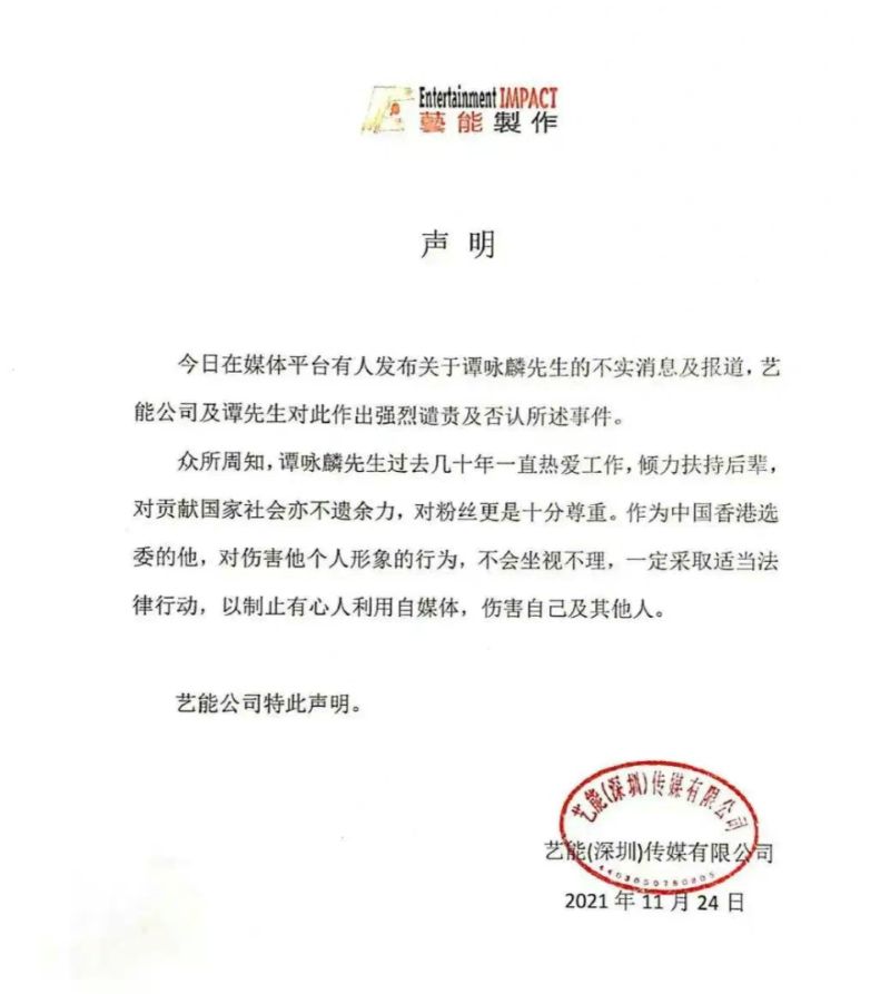 隨著話題引起關注,譚詠麟所屬經紀公司發文,表示強烈譴責及否認,並將採取適當法律行動。
