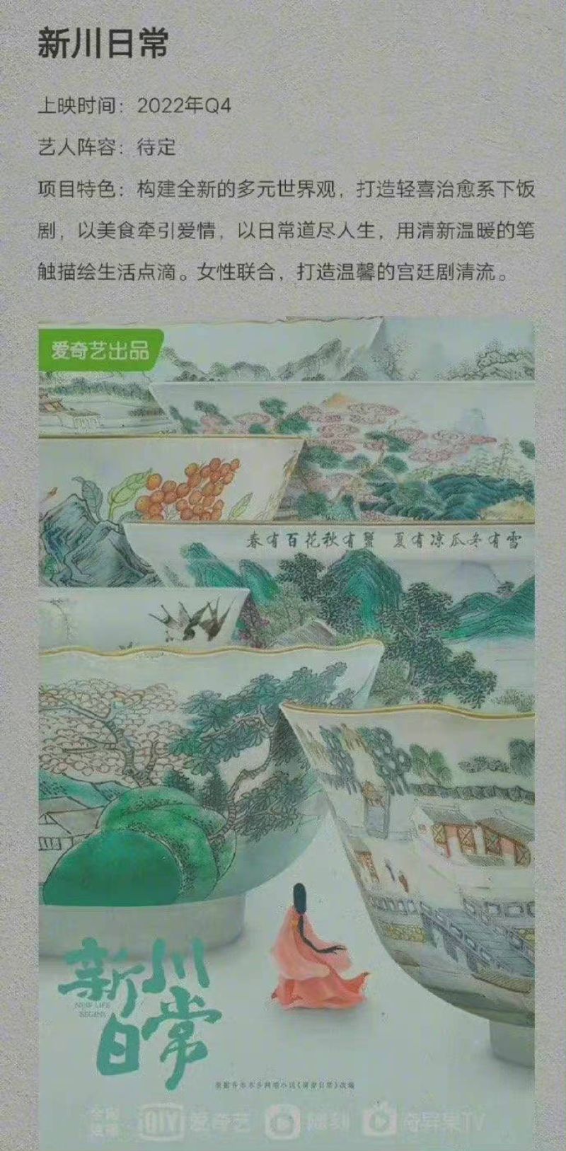 這部由白敬亭出任男主、女主是田曦薇的電視劇《新川日常》,預計在2023年起上映播出。這部劇是根據多木木多小說《清穿日常》改編,故事講述了女主李薇穿越到清朝後,發生的各種搞笑故事。該劇是以全新世界觀構建宮廷劇中的清流,融合了多元婚戀觀與兩性話題,反宮鬥、反雌競爭,沖破了男性凝視,彰顯了女性的力量。