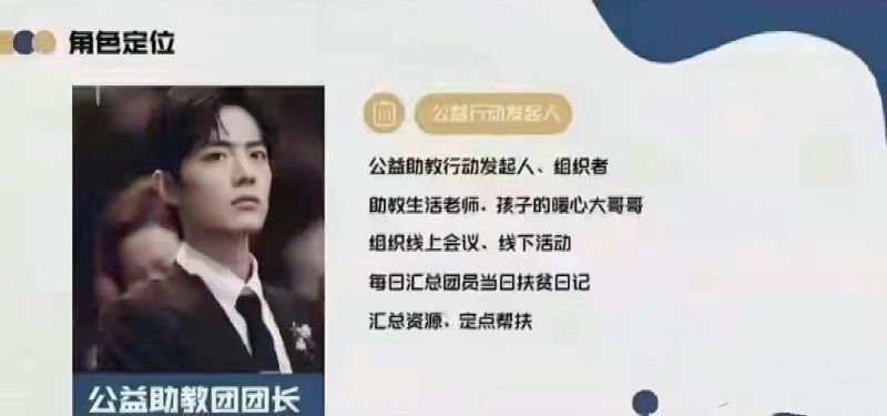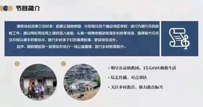 節目招商PPT直接放出,肖戰將召集三位好友,分別前往四個偏遠地區學校,進行為期15天的助教工作,通過同吃同住同上課的深入體驗,從第一視角挖掘和發現鄉村教育背後,值得被大眾關注並施以援手的幫扶點,助力鄉村孩子們的教育,而且還將進行一場公益直播。
