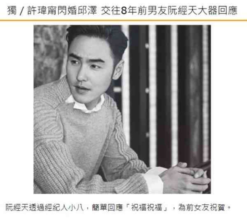 另外,許瑋甯曾和阮經天交往八年,在2015年分手。隨後在2017年,許玮甯與劉又年交往並結婚,但今年4月,她宣布兩人因聚少離多而離婚。對於許瑋甯閃婚邱澤,阮經天同樣以四字:「祝福祝福」回應。