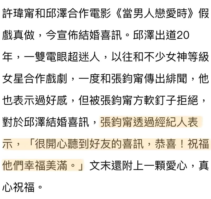 對於兩人閃婚,張鈞寧也透過經紀人表示:「很開心聽到好友的喜訊,恭喜!祝福他們幸福美滿❤️」