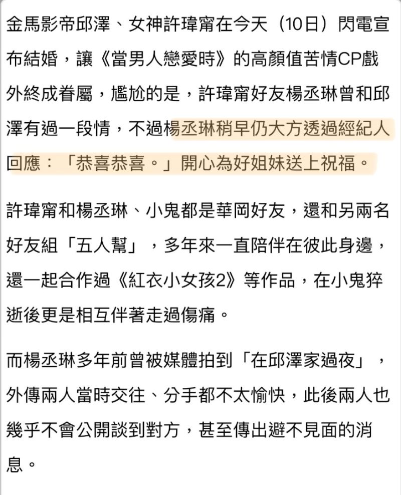 隨著兩人官宣,兩人之前的前任和緋聞對象,也紛紛大方送祝福!首先,先從許瑋甯這邊說起,她嫁給邱澤,絕對是一個“我嫁給我20年閨蜜的前前前前男友”的故事!總所周知,許瑋甯和楊丞琳是高中同學,從高中起就是超級死黨!