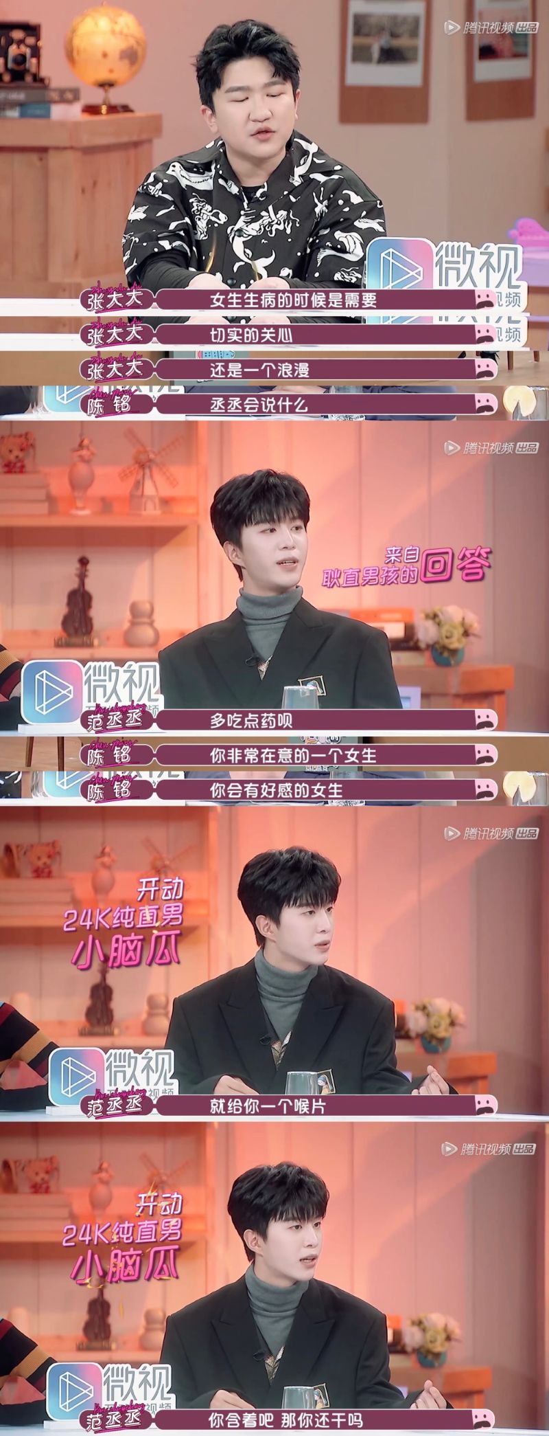 當張大大詢問覺得女生生病的時候是需要切實的關心,還是一個浪漫的行為時,范丞丞:「多吃點藥唄!」
