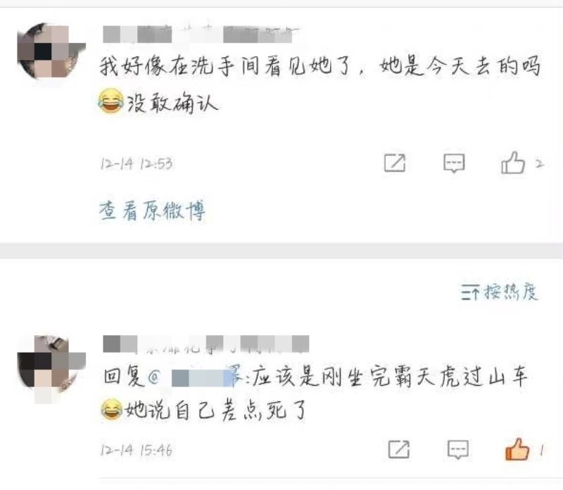 另一名偶遇的網友則表示,在洗手間遇見楊冪,說自己坐完過山車後差點死了!哈哈哈哈哈哈~有那個畫面了!