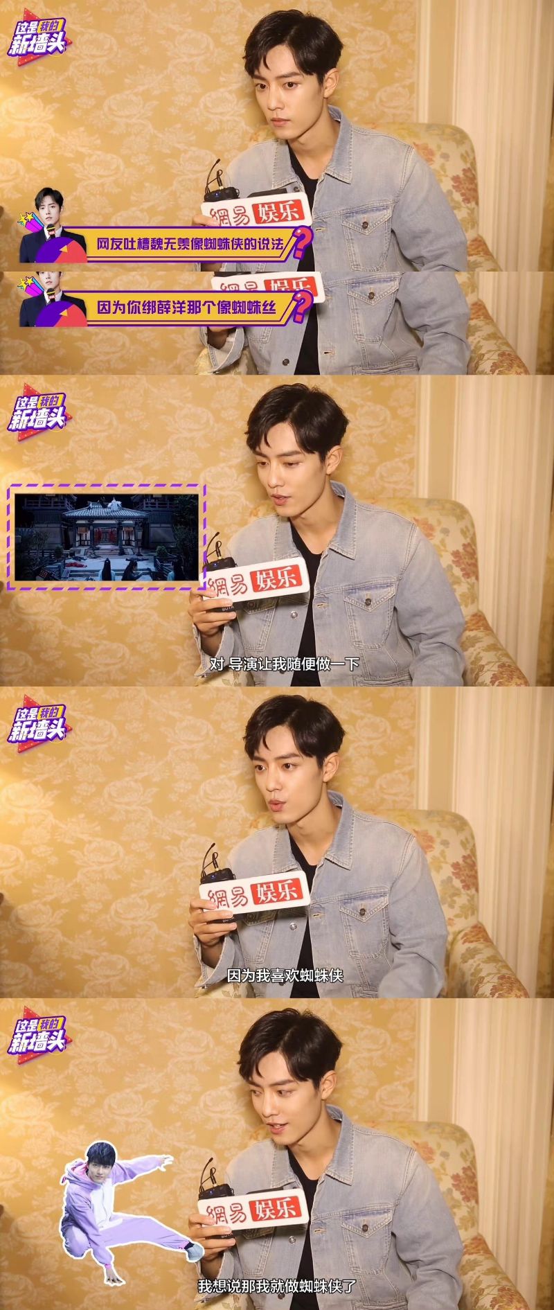 在《陳情令》中,肖戰飾演的魏無羨曾被網友吐槽像蜘蛛俠,他也坦然表示:「導演讓我隨便做一下,因為我喜歡蜘蛛俠,所以就做蜘蛛俠了。」