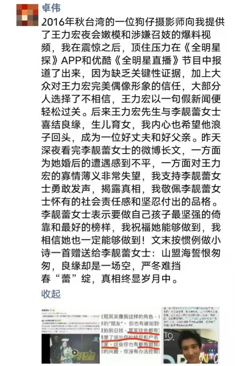 「2016年秋台灣的一位狗仔攝影師向我提供了王力宏夜會嫩模和涉嫌召妓的爆料視頻,我在震驚之後,頂住壓力在《全明星探》APP和優酷《全明星直播》節目中報道了出來,因為缺乏關鍵性證據,加上大衆對王力宏完美偶像形象的信任,大部分人選擇了不相信,王力宏以一句假新聞便輕松過關。後來王力宏先生與李靓蕾女士喜結良緣,生兒育女,我內心也希望他浪子回頭,成為一位好丈夫和好父親。昨天深夜看完李靓蕾女士的微博長文,一方面為她婚後的遭遇感到不平,一方面對王力宏的寡情薄義非常失望,我支持李靓蕾女士勇敢發聲,揭露真相,我敬佩李靓蕾女士懷有的社會責任感和堅忍付出的品格。李靓蕾女士表示要做自己孩子最堅強的倚靠和最好的榜樣,我祝福她能夠做到,我相信她也一定能夠做到!文末按慣例做小詩一首贈送給李靓蕾女士:山盟海誓恨匆匆,良緣卻是一場空,嚴冬難擋春“蕾”綻,真相終顯歲月中。」