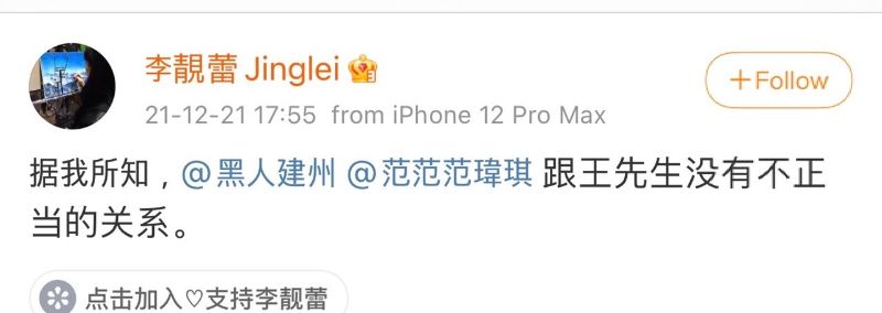 結果沒想到李靚蕾居然在21號傍晚發文,並艾特了黑人和范瑋琪的微博號,表示:「據我所知,黑人建州和范瑋琪跟王先生沒有不正當的關係。」直接打臉傳聞!