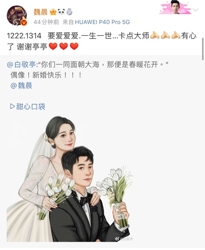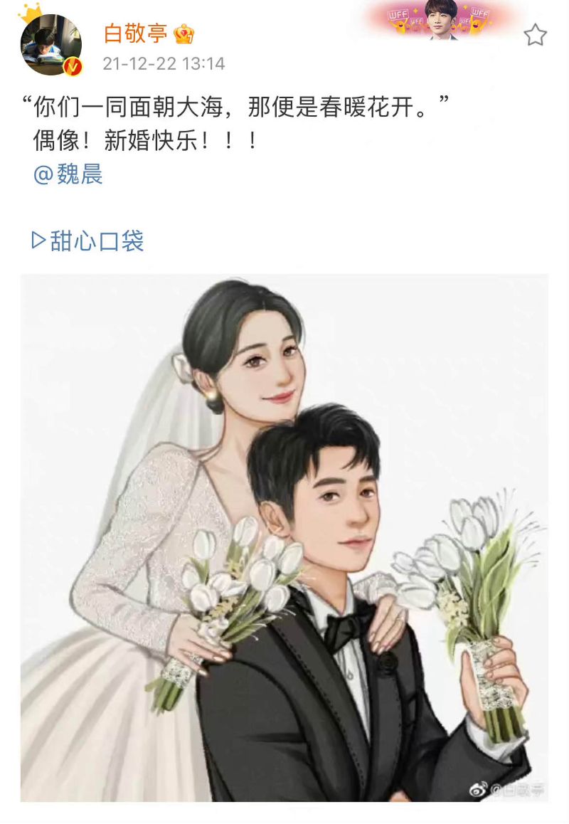 身為魏晨多年的資深”粉絲“白敬亭,也特別在22號卡點13:14,發文祝福”偶像“新婚快樂:「“你們一同面朝大海,那便是春暖花開。”偶像!新婚快樂!!!」並點了一首魏晨的《甜心口袋》給魏晨夫婦!