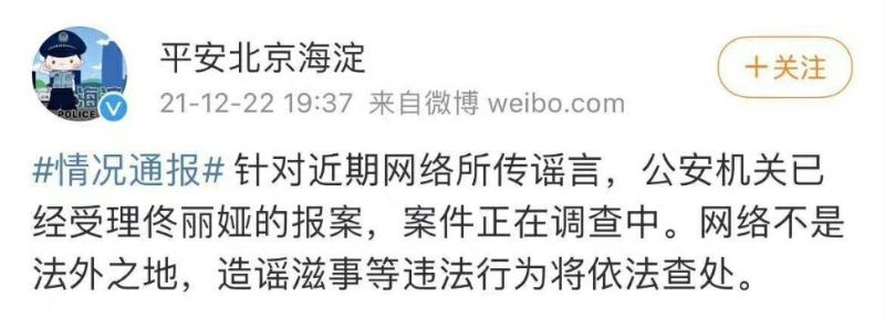 更匪夷所思的是,22號晚上,「平安北京海淀」警方微博號居然發文,表示已經受理有關佟麗婭的報警,並強調“造謠”是犯法的!