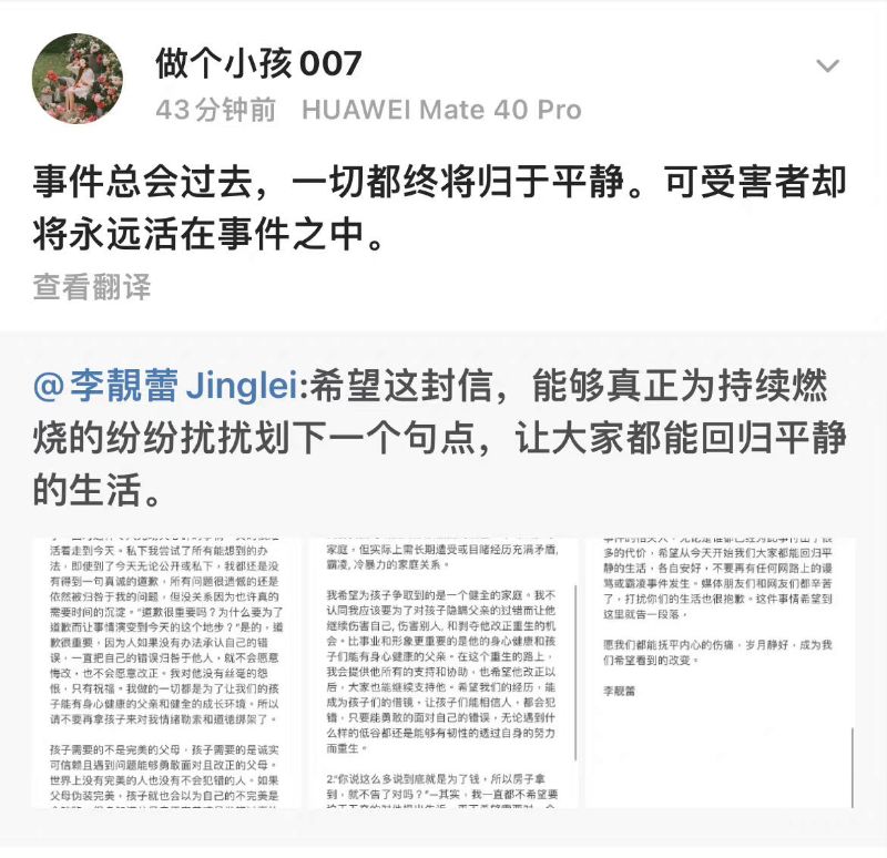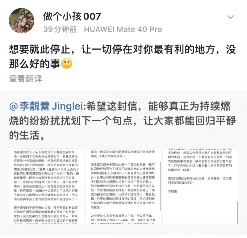 新聞:李靚蕾再發長文!最後一次回應站出來的原因:「不要拿孩子對我道德綁架!」
