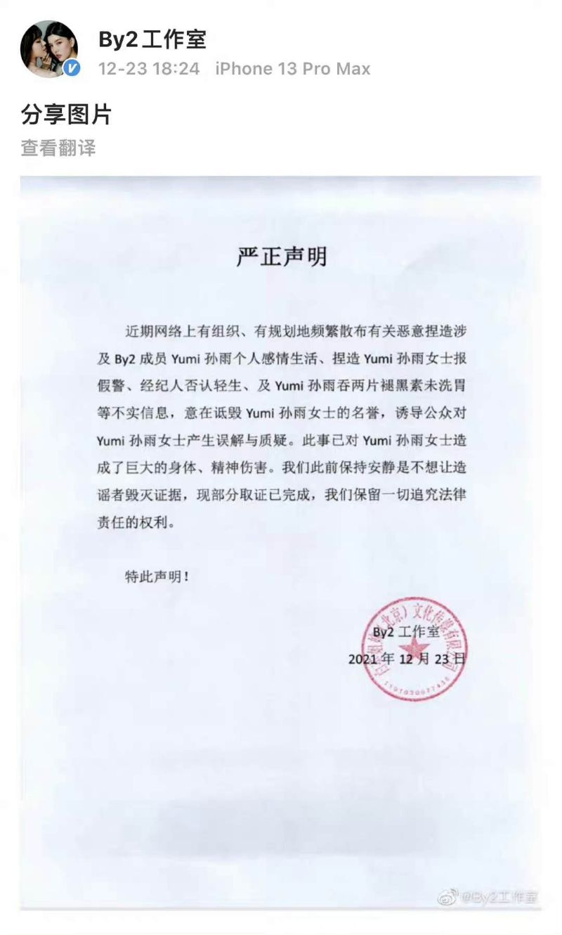隨後,By2工作室第三次發聲明,表示網上有組織、有規劃地頻繁散布Yumi個人感情生活、捏造Yumi報假警、經紀人否認輕生、Yumi吞兩片褪黑素未洗胃等不實信息,意在诋毀Yumi名譽,稱此前保持安靜是不想讓造謠者毀滅證據,部分取證已完成,保留依法追責權利。
