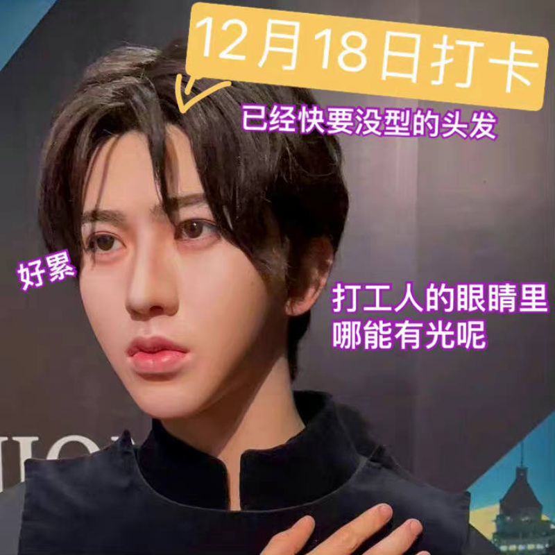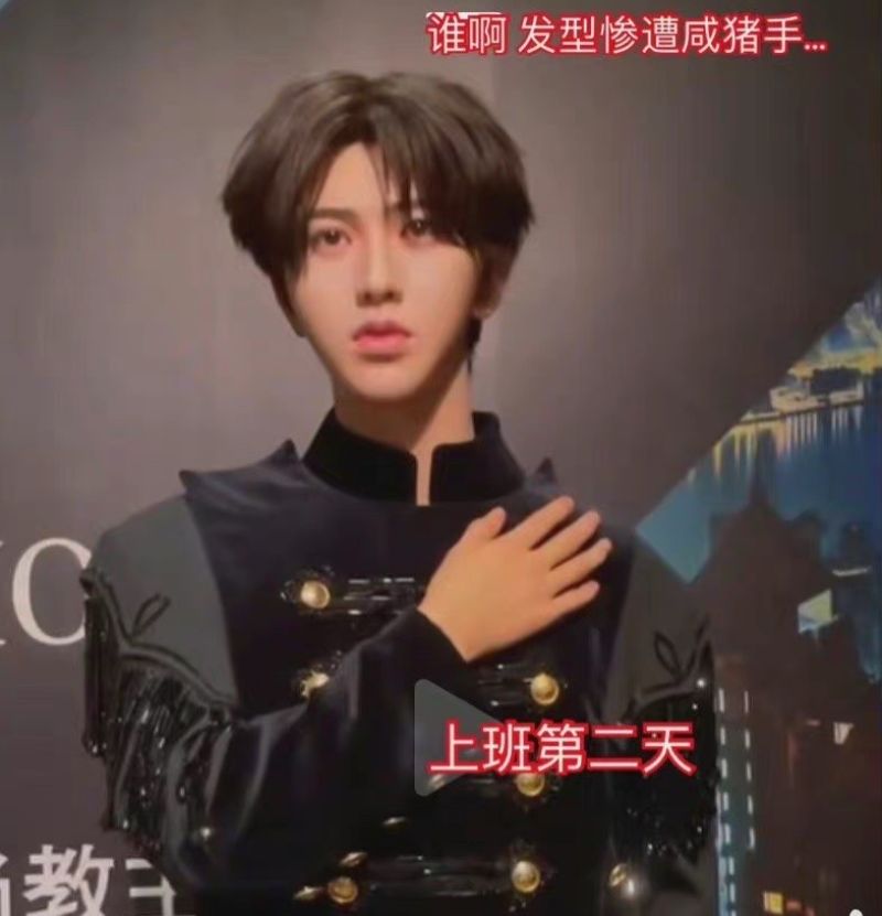 但沒想到,陸續有愛坤打卡,發現蠟像的髮型就和我們打工人一樣…隨著上班的日子增加而日漸…邋遢!來看看上班第二天的坤坤,髮型開始有點不太一樣👇
