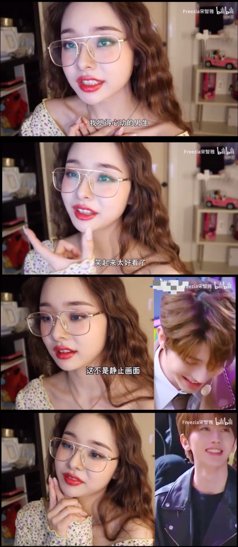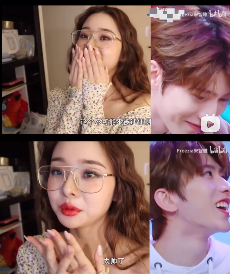 第一次是當她在接受「不心動挑戰」,在很多男生視頻裡做出的reaction時,一看到蔡徐坤的視頻立刻尖叫:「這個不可能不被迷住啊!」、「太帥了!」👇