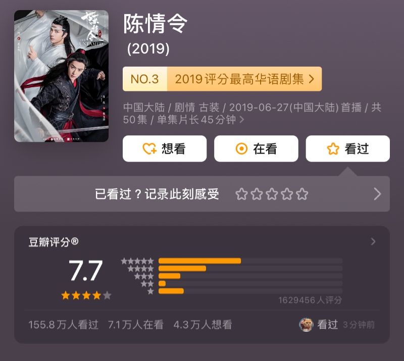 而《陳情令》在豆瓣的評分人數,更是一直遙遙領先,至今接近160萬的評分人數,可以說創下無數次記錄,至今無劇能破!