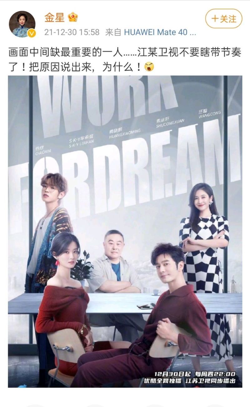 結果,金星直接發文槓上電視台,發了《了不起的打工人》海報,質問:「畫面中間缺最重要的一人……江某衛視不要瞎帶節奏了!把原因說出來,為什麼!」