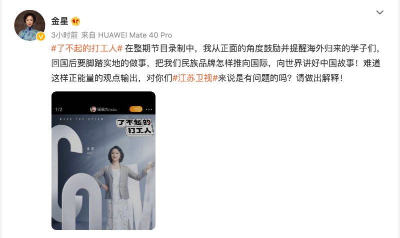 隨後金星更二度更文:「在整期節目錄制中,我從正面的角度鼓勵並提醒海外歸來的學子們,回國後要腳踏實地的做事,把我們民族品牌怎樣推向國際,向世界講好中國故事!難道這樣正能量的觀點輸出,對你們#江蘇衛視#來說是有問題的嗎?請做出解釋! 」