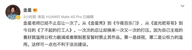 「金星老師已經不止忍讓一次了。從《金星秀》到《今夜百樂門》,從《追光吧哥哥》到今日的《了不起的打工人》。一次次的忍讓卻換來一次又一次的打壓。因為自己主觀的喜好就濫用公權力刪減或者限制甚至暫時禁止其作品。第一是歧視,第二是公權力的濫用。這樣可一點也不利于法治建設。」