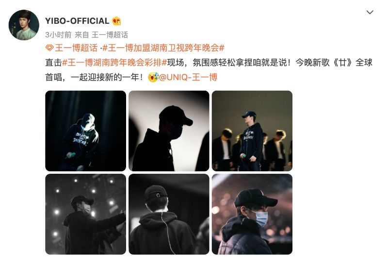 來看看Official的文案:「直擊王一博湖南跨年晚會彩排現場,氛圍感輕松拿捏咱就是說!今晚新歌《廿》全球首唱,一起迎接新的一年!」從文字也可以感受到王一博的放鬆感啊!