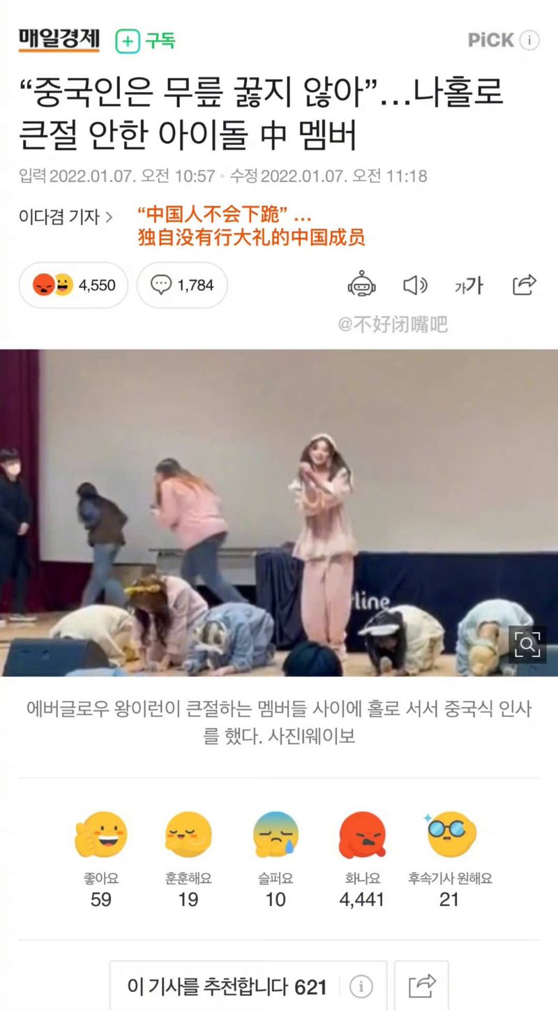 原本僅是在論壇上發酵的課題,隨著7號被韓國媒體以「“中國人不會下跪”…獨自沒有行大禮的中國成員」為標題報導了之後,引起了突破千樓的評論!多達四千多網友也以“生氣”的表情符號,表達了自己的看法!
