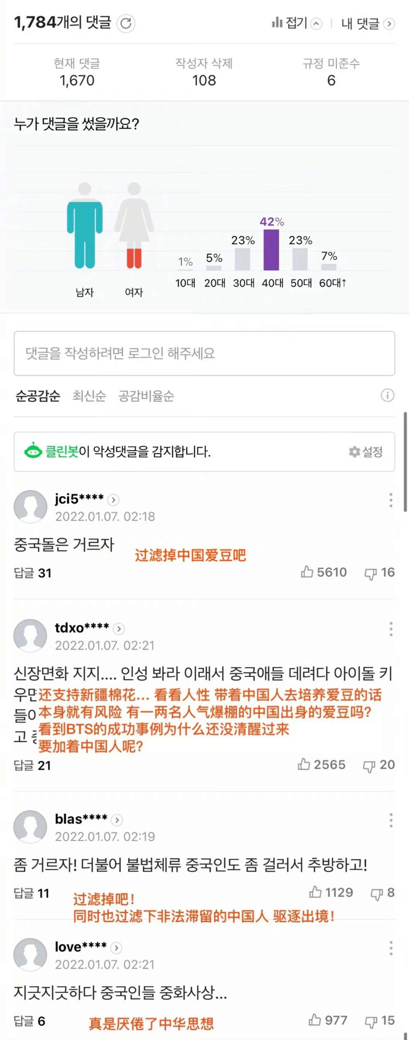 「還支持新疆棉花…看看人性,帶著中國人去培養愛豆的話本身就有風險,有一兩名人氣爆棚的中國出身的愛豆嗎?看到BTS的成功事例,為什麼還沒清醒過來要加著中國人呢?」