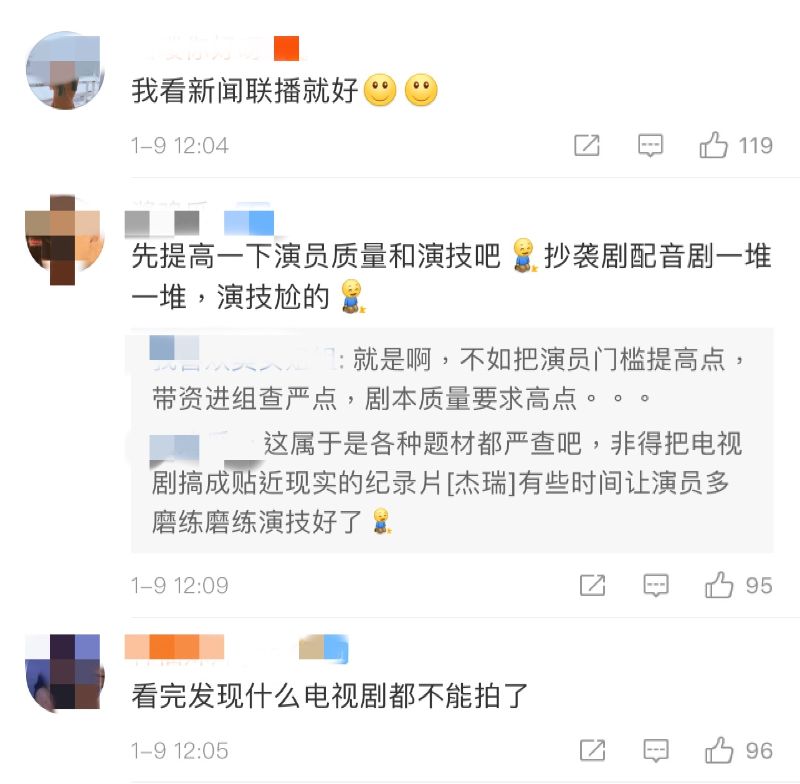 「先提高一下演員質量和演技吧!抄襲劇配音劇一堆一堆,演技尬的!」