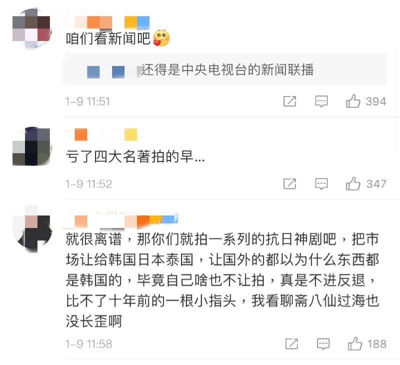 「就很離譜,那你們就拍一系列的抗日神劇吧!把市場讓給韓國日本泰國,讓國外的都以為什麼東西都是韓國的,畢竟自己啥也不讓拍,真是不進反退,比不了十年前的一根小指頭,我看聊齋八仙過海也沒長歪!」