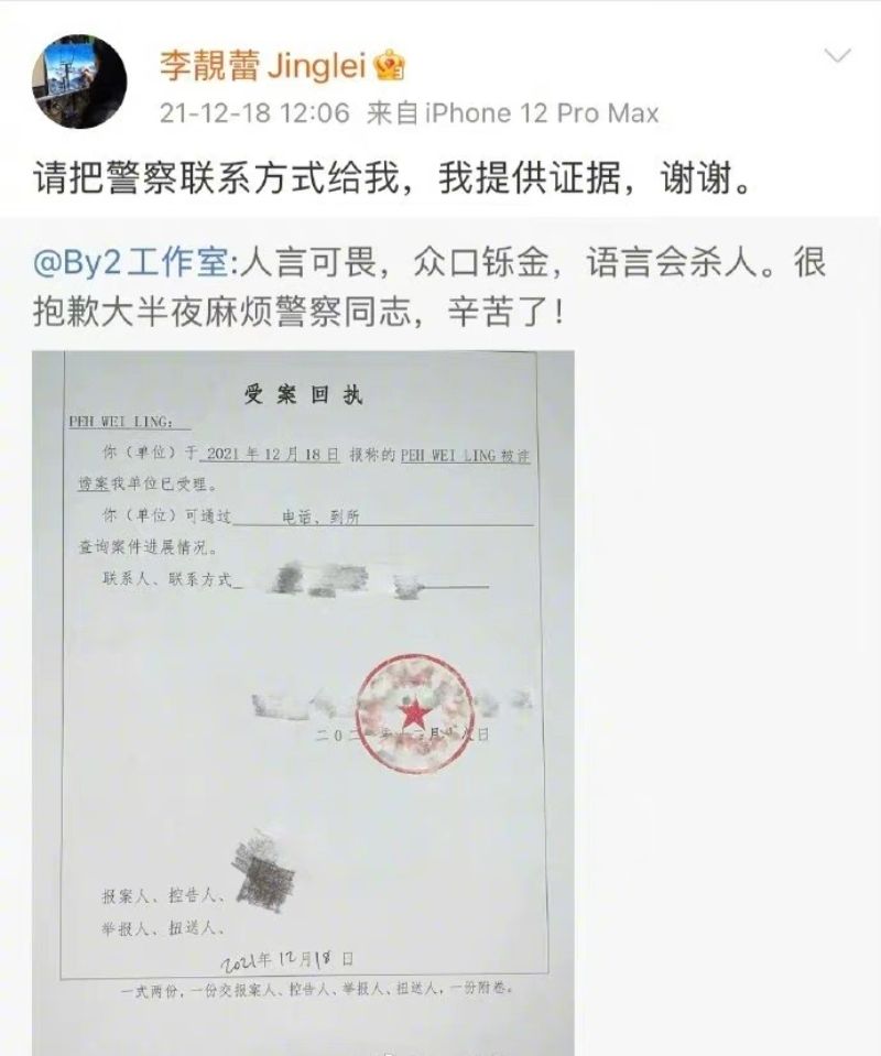 人不在內地的李小姐,請配合警方完成關于你造謠誹謗一事的刑事調查與追究。@李靚蕾Jinglei