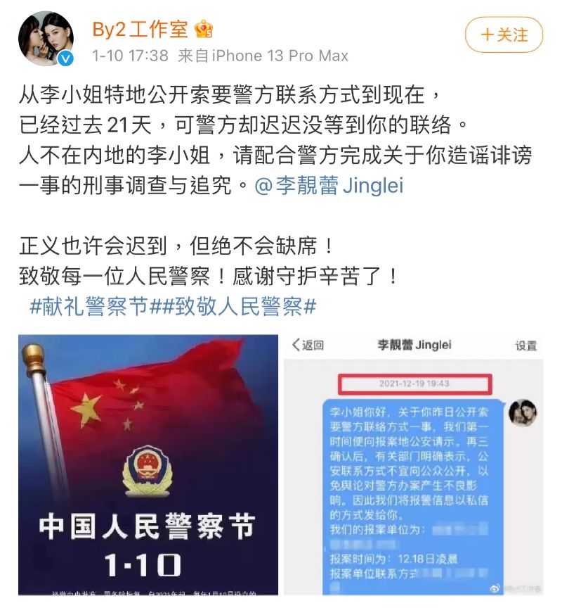 之前,隨著by2工作室發文表示已經報警,李靚蕾轉發並表示請提供警方聯繫方式,自己可以提供證據。