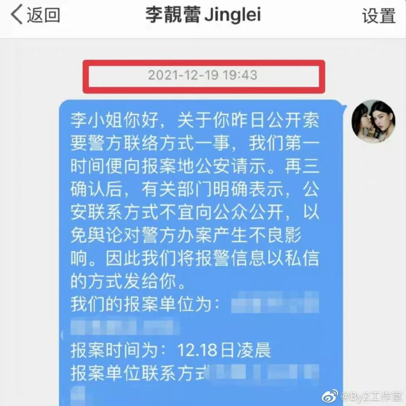 工作室公開了自己pm給李靚蕾的對話,顯示在2021年12月19日,工作室就已經聯繫李靚蕾,提供有關公安的報警方式。