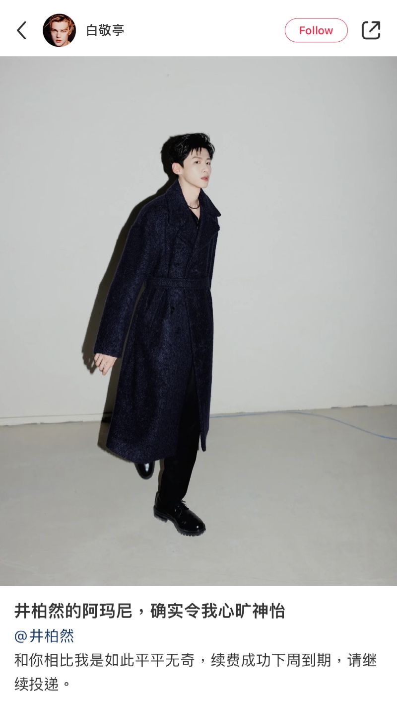 甚至為了阿曼尼,對於井柏然的回復:「帥,差一點就超于我了」,僅回復:「不知道說什麼,給你拜個早年吧!」還回復網友,自己和井柏然是借同一個衣櫃…
