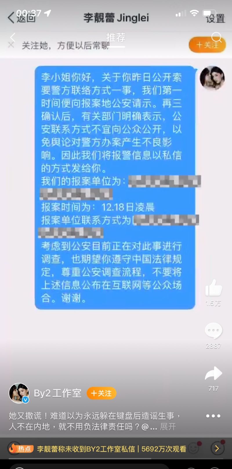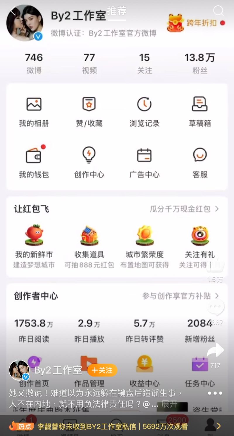 這…回復得好快哦!針對李靚蕾在11號深夜發長文,回應並未收到by2工作室私信一事,by2工作室在12號也回應了!