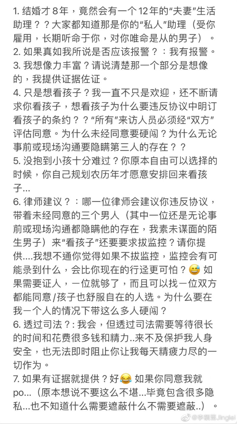 李靚蕾回應:我一直請求你看孩子,但想看孩子為什麼為什麼要違反條約帶人硬闖,並隱瞞第三人的存在更何況,原本就是王力宏自己規劃農曆年才願意回來看孩子。如果是律師建議,請問是哪位律師建議的。